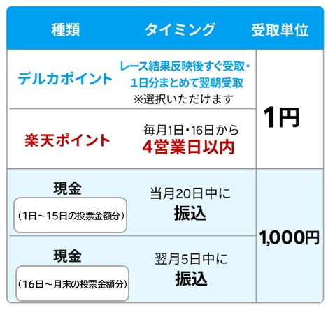 ※最終レース終了~集計前の間(0:05まで)に自動受取を【デルカ】へ変更した場合、当日分すべてがデルカポイントで付与されます。