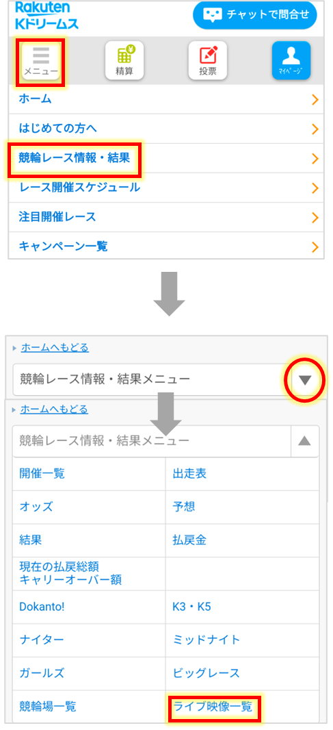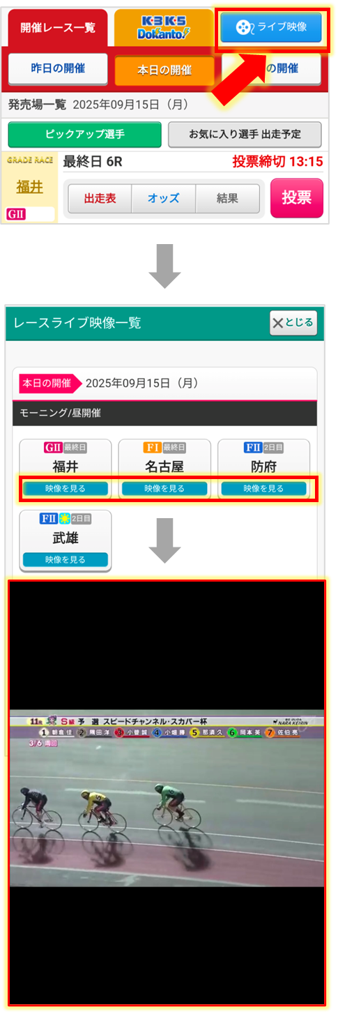 ホーム画面の【競輪レース情報・結果】→【ライブ映像一覧】からお進みください。