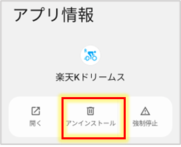 【設定】→【アプリ】から楽天Kドリームスアプリを検索し、【アンインストール】を選択