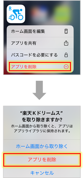 ホーム画面で楽天Kドリームスのアイコンを長押し→【アプリを削除】→【アプリを削除】を選択